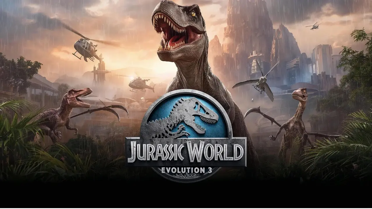 Jurassic World Evolution 3 logo with roaring dinosaurs and cinematic background.
